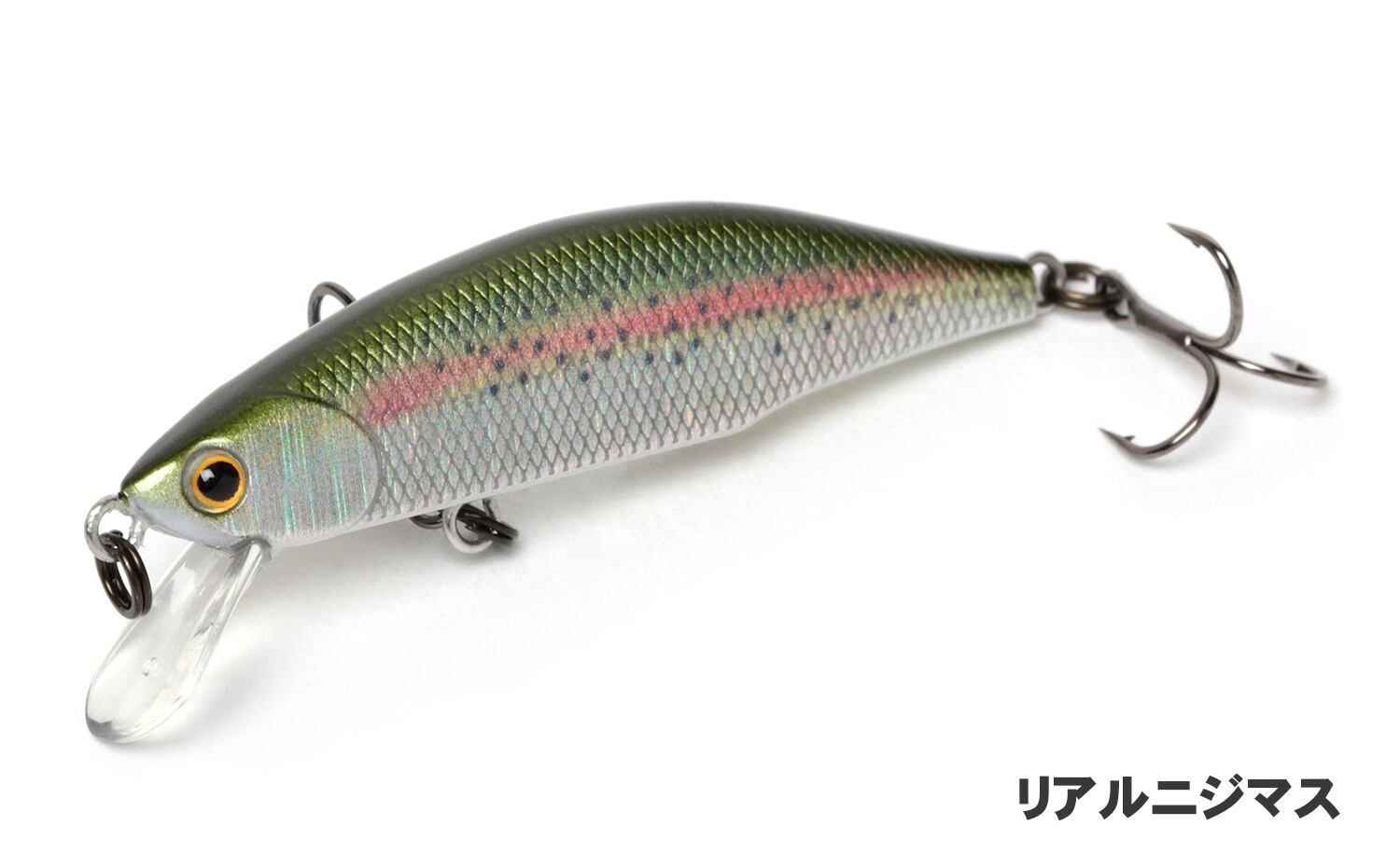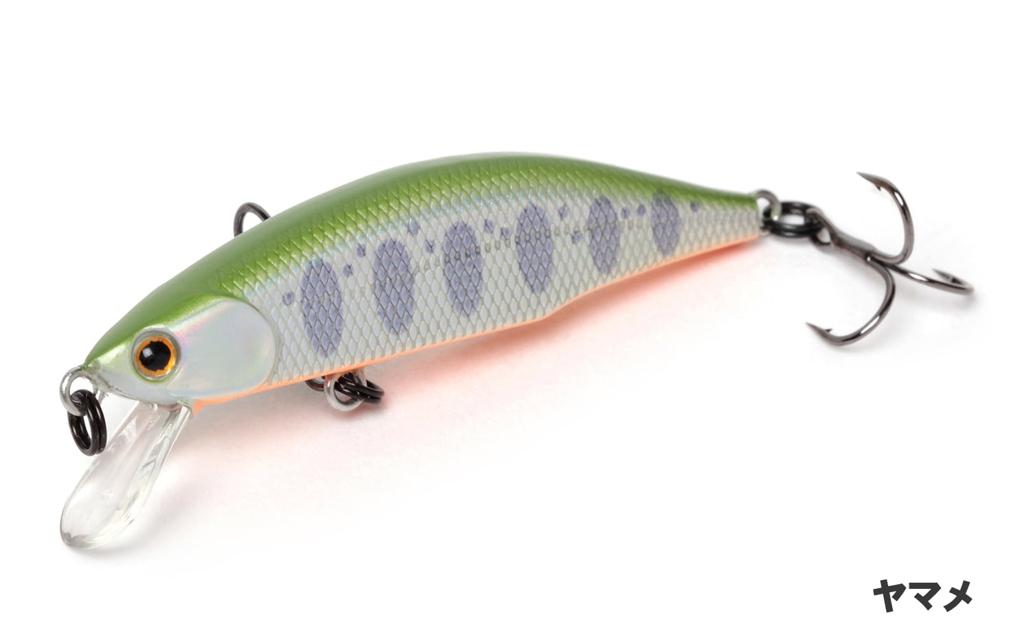フラットサイドボディで体高を持たせることにより、限界ギリギリまで重心を下げたウェイトバランスで激流の中でも水中を飛び出すことはありません。それでいて、ジャークやトゥイッチにおいてもアングラーの意図するように追従してくれます。また、タングステンウェイトを絶妙な配置でコンパクトなボディに搭載し、フォール姿勢は水平にヒラ打ちしながらターゲットを誘うことができます。現在の渓流ミノーにおいてスタンダードとなるミノーです。